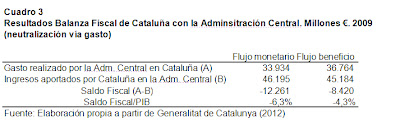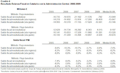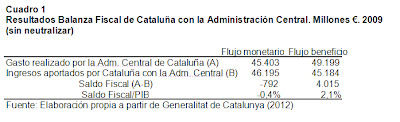 Hay que señalar que los resultados obtenidos en uno y otro enfoque, pueden resultar muy diferentes debido, sobre todo, a la diferente manera de imputar los gastos de la administración central en los diferentes territorios. El cuadro 1, que ha sido elaborado a partir de los datos proporcionados por el Departamento de Economía y Conocimiento de la Generalidad de Cataluña, permite ver estas diferencias. El año 2009 los ingresos aportados por Cataluña a la administración central (estado, organismos autónomos, seguridad social y empresas públicas) fueron de 46.195 millones de euros, según el método del flujo monetario, y los gastos realizados en Cataluña por esta administración fueron de ser 45.403 millones de euros. Eso da un déficit fiscal de 792 millones de euros (el 0,4% del PIB). En cambio si se utiliza el método del flujo del beneficio los ingresos aportados son 45.184 millones de euros y el gasto recibido de es 49.199 millones de euros. Esto supone un superávit fiscal de 4.015 millones de euros (el 2,1% del PIB).