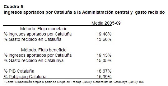Aplicando este criterio al caso de Cataluña significaría que su aportación al conjunto de ingresos de la administración central, tendría que haber sido durante los años 2005-09 de un 18,67% que, tal como muestra el cuadro 5, es el peso que tuvo el PIB de Cataluña sobre el total. Dicho de otra manera, del total de ingresos que dispuso la administración central, el 18,67% tendrían que haber procedido de Cataluña. El mismo cuadro 4 nos muestra que este porcentaje fue más elevado (de un 19,48% utilizando el método del flujo monetario, y de un 19,13% utilizando el método del flujo del beneficio). Eso quiere decir que Cataluña aportó más de lo que le hubiera tocado si se hubiera aplicado aquel principio normativo.