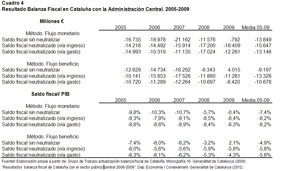 Estos datos, además de ofrecer una perspectiva dinámica del comportamiento del saldo fiscal, permiten afirmar que, si se toman los resultados correspondientes a los dos métodos neutralizados vía ingreso, que tal como se ha visto es la metodología más utilizada, Cataluña ha aportado a la administración central, durante los años 2005-2009, un saldo fiscal neto de 15.646,6 millones de euros anuales (el 8,2% del PIB) si se utiliza el método del flujo monetario, o de 13.328,2 millones de euros (el 5,8% del PIB) si se utiliza el método del flujo del beneficio. Aunque se señalen sólo estas dos cifras es importante poder disponer del resto, porque tal como se ha dicho, cada una de ellas tiene un significado diferente y juntas ofrecen una panorámica más completa y esmerada de la situación.