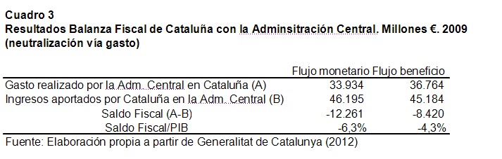 Hay que señalar que los resultados obtenidos en uno y otro enfoque, pueden resultar muy diferentes debido, sobre todo, a la diferente manera de imputar los gastos de la administración central en los diferentes territorios. El cuadro 1, que ha sido elaborado a partir de los datos proporcionados por el Departamento de Economía y Conocimiento de la Generalidad de Cataluña, permite ver estas diferencias. El año 2009 los ingresos aportados por Cataluña a la administración central (estado, organismos autónomos, seguridad social y empresas públicas) fueron de 46.195 millones de euros, según el método del flujo monetario, y los gastos realizados en Cataluña por esta administración fueron de ser 45.403 millones de euros. Eso da un déficit fiscal de 792 millones de euros (el 0,4% del PIB). En cambio si se utiliza el método del flujo del beneficio los ingresos aportados son 45.184 millones de euros y el gasto recibido de es 49.199 millones de euros. Esto supone un superávit fiscal de 4.015 millones de euros (el 2,1% del PIB).