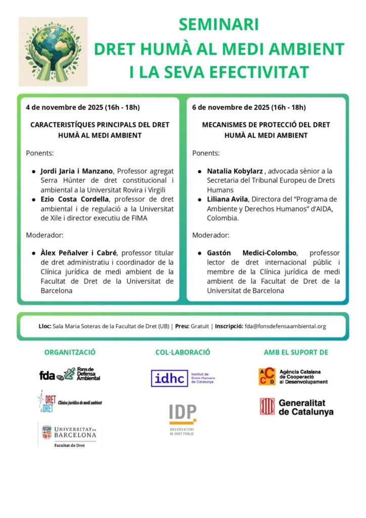 Els dies 4 i 6 de novembre, de 16:00 a 18:00 h, tindrà lloc a la Sala Maria Soteras (A-411) de la Facultat de Dret de la Universitat de Barcelona el seminari “Dret humà al medi ambient i la seva efectivitat”, organitzat per la Clínica Jurídica de Medi Ambient i el Fons de Defensa Ambiental i amb la col·laboració de l’Observatori de Dret Públic IDP Barcelona.