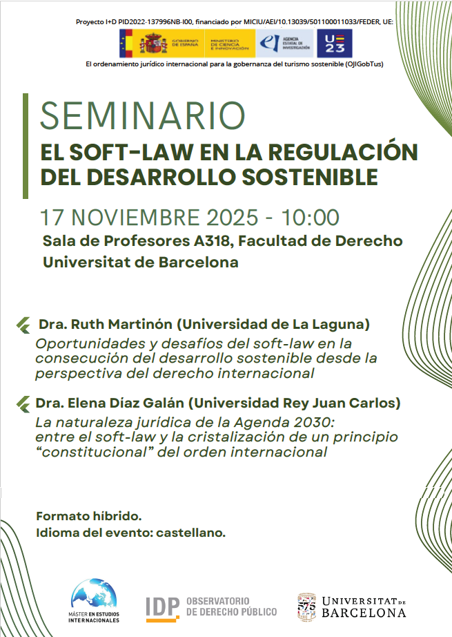 El próximo lunes 17 de noviembre de 2025, se celebrará el seminario “El soft law en la regulación del desarrollo sostenible”, un espacio para profundizar en el debate sobre el soft-law como fuente del derecho internacional y analizar su incidencia en la regulación del desarrollo sostenible, abordando tanto sus oportunidades como sus límites.